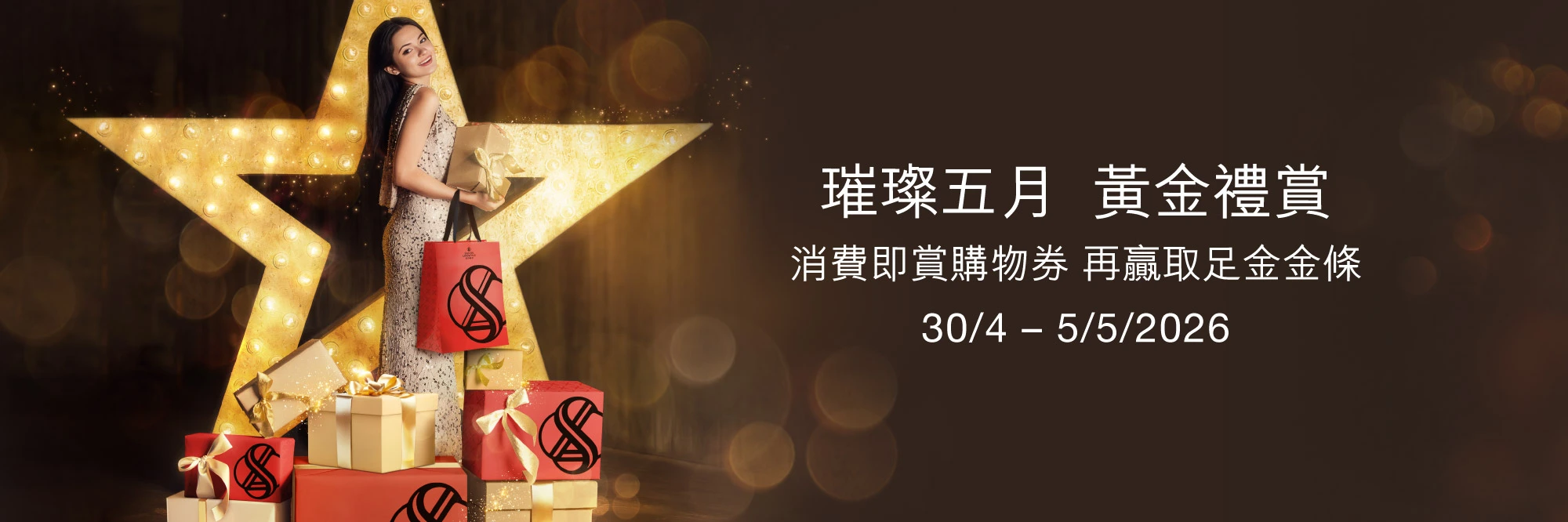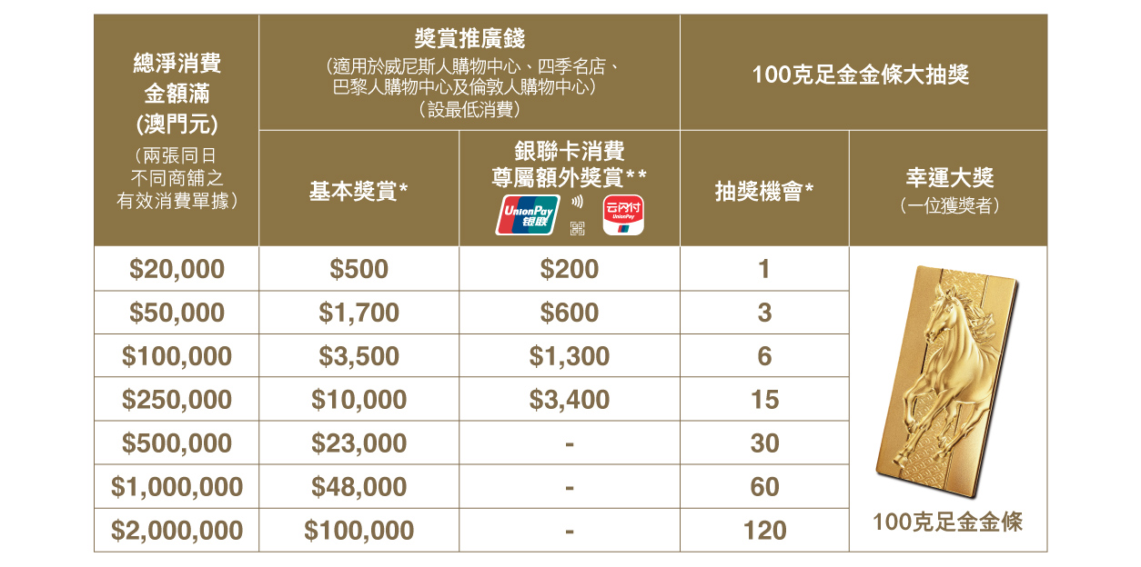 現凡於威尼斯人購物中心、四季名店、巴黎人購物中心及倫敦人購物中心購物滿澳門元20,000元或以上,即可獲贈價值高達澳門元100,000元之獎賞推廣錢,更可參加幸運大抽獎,贏取100克足金金條,使用銀聯卡簽賬更享高達澳門元3,400元之額外獎賞推廣錢!獎賞推廣錢可於超過400家參與商舖及專櫃使用。