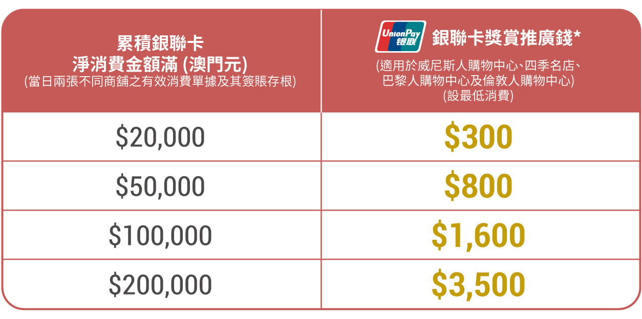 現凡於2026年3月20日至22日、3月27日至29日及4月3日至7日於威尼斯人購物中心、四季名店、巴黎人購物中心及倫敦人購物中心以銀聯卡消費簽賬滿澳門元20,000元或以上,即可獲贈價值高達澳門元3,500元之銀聯卡獎賞推廣錢,可於澳門金沙購物城邦超過500家參與商舖及專櫃使用。