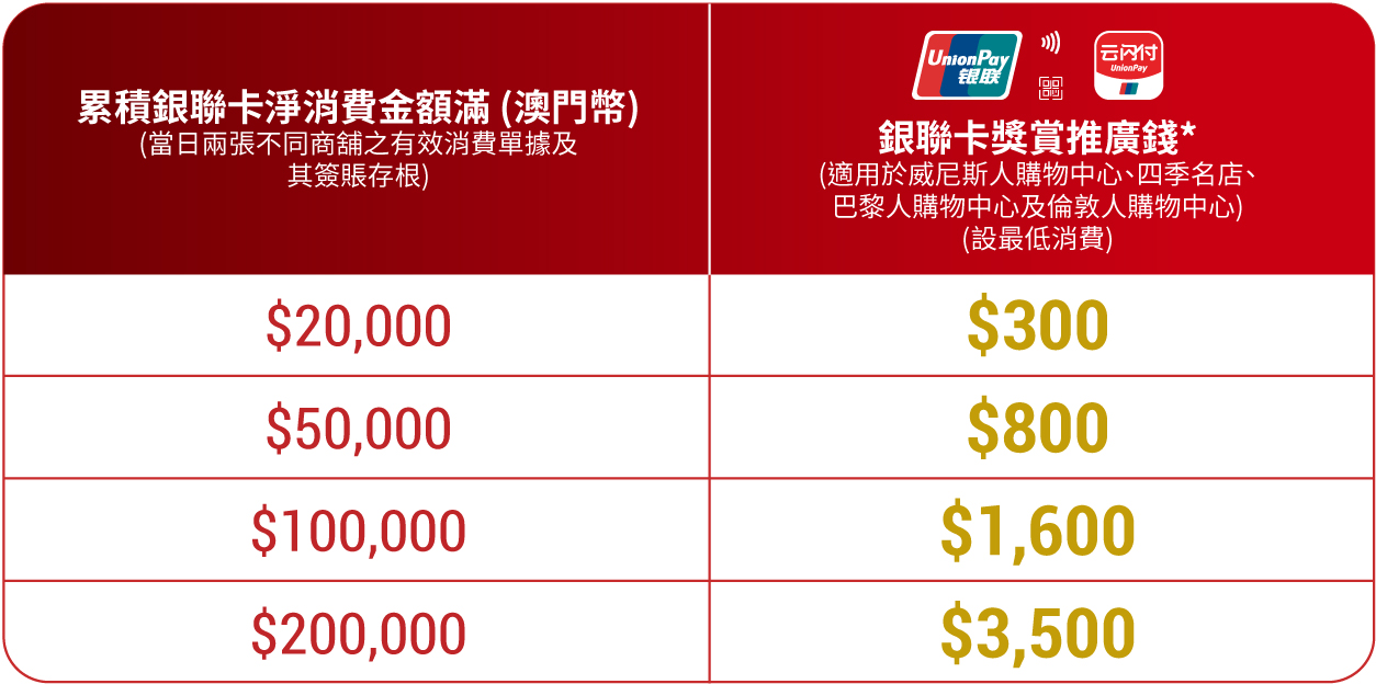 現凡於2025年12月12日至14日、12月19日至28日及2026年1月1日至4日於威尼斯人購物中心、四季名店、巴黎人購物中心及倫敦人購物中心以銀聯卡消費簽賬滿澳門幣20,000元或以上,即可獲贈價值高達澳門幣3,500元之銀聯卡獎賞推廣錢,可於澳門金沙購物城邦超過500家參與商舖及專櫃使用。