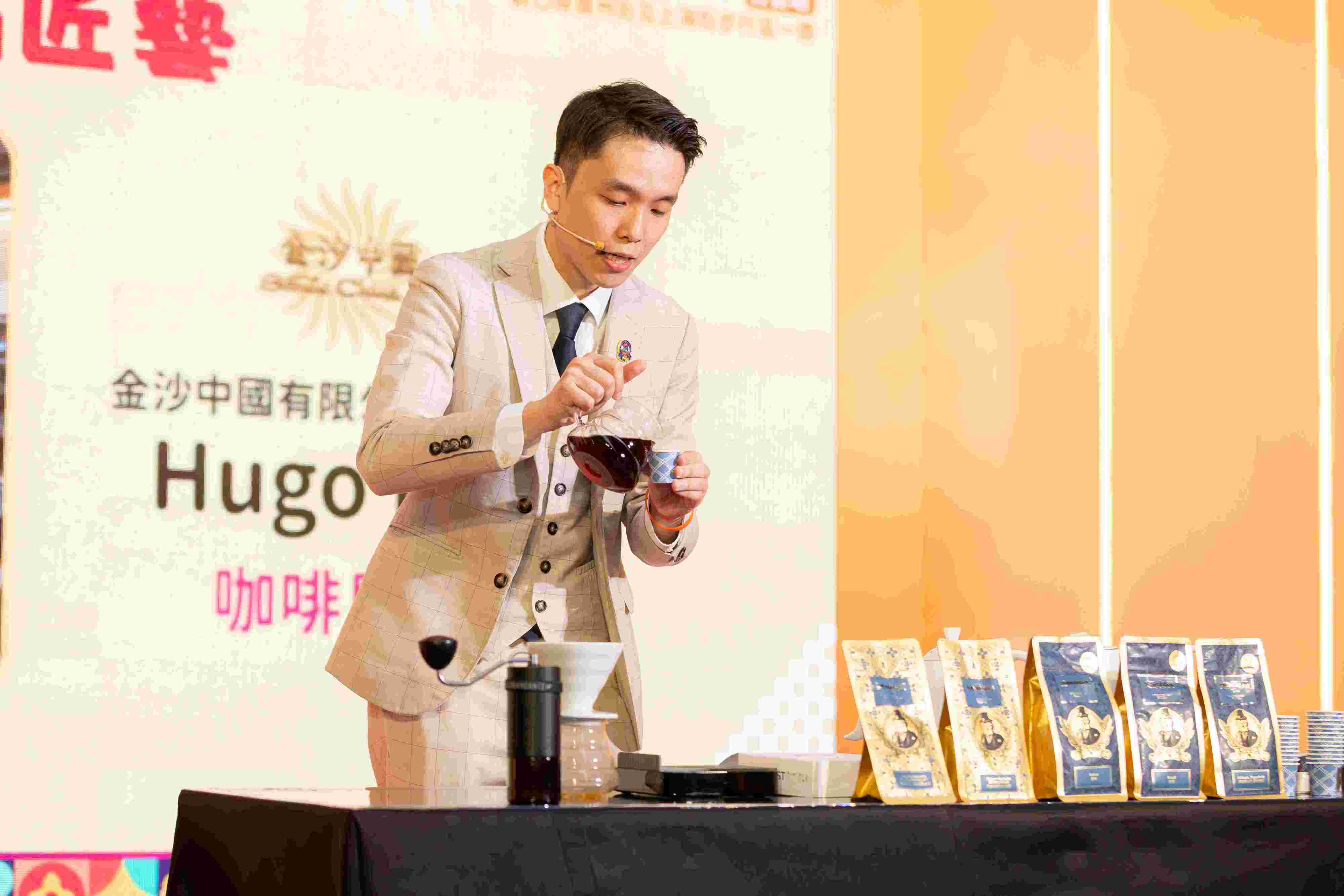 圖片說明: 金沙中國得獎咖啡師范豪傑展示咖啡冲泡的技巧。